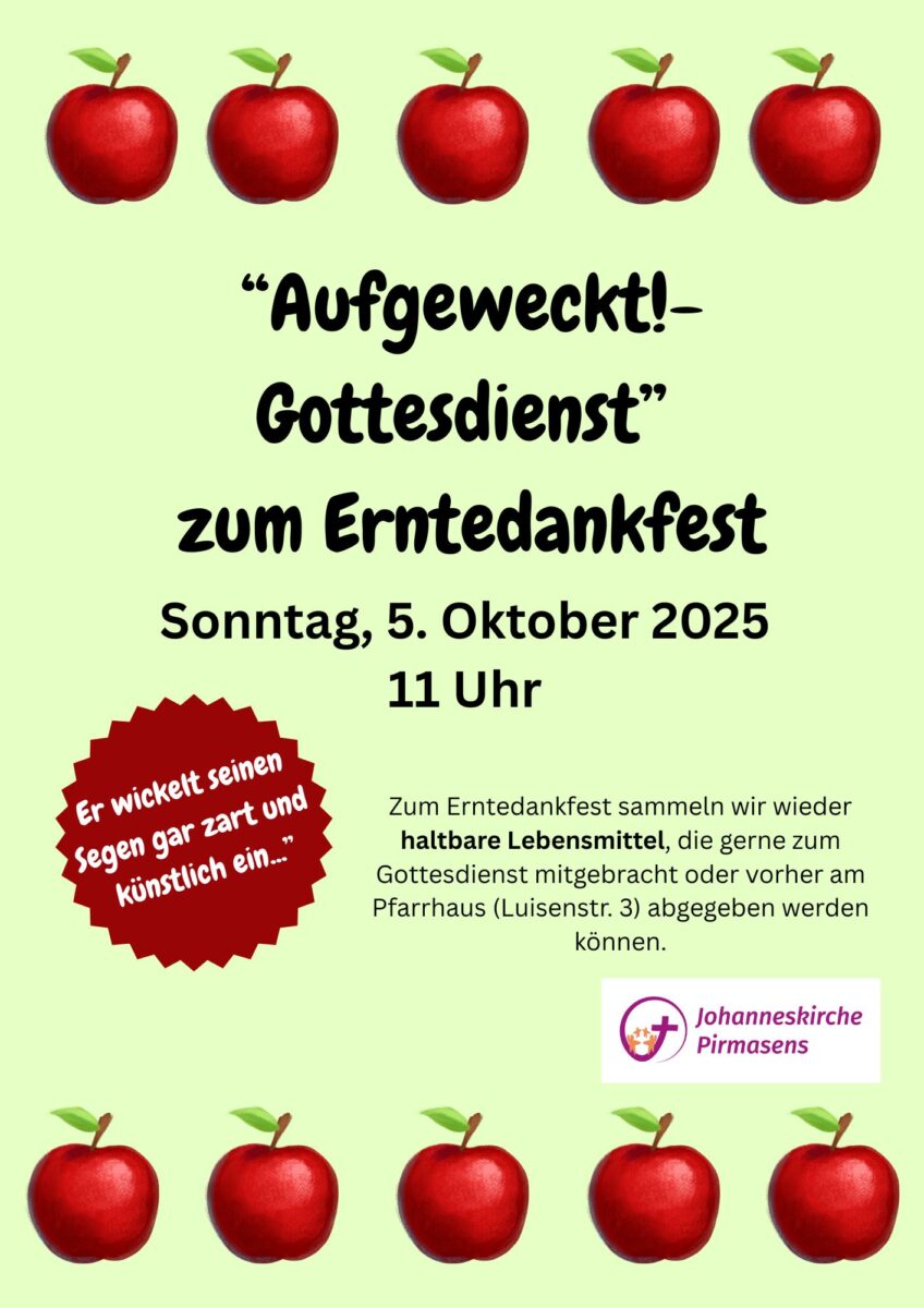 Jedes Jahr steht der Dank für die Gaben im Mittelpunkt der Gottesdienste zum Erntedankfest. Wir laden euch ein, bewusst wahrzunehmen, wie wir in heutiger Zeit an einfachen Dingen Freude und Dankbarkeit erfahren können. Dabei wird der Apfel eine besondere Rolle spielen. Unser „Aufgeweckt!“-Team hat sich dazu wieder einige Gedanken gemacht und schöne Dinge vorbereitet. Wir …